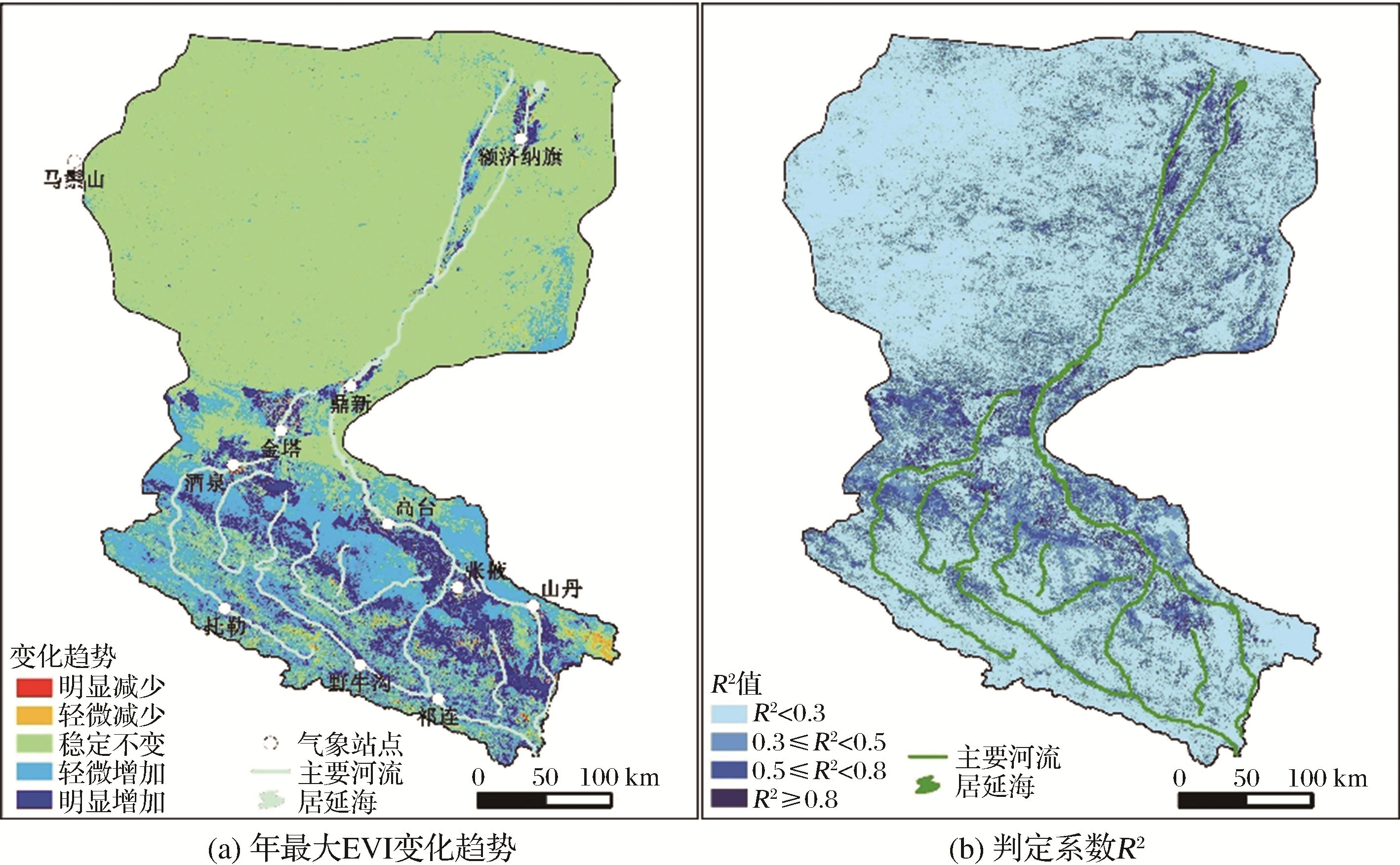| 图3 黑河流域2001~2017年年最大EVI变化趋势分布图与判定系数R2分布图 |