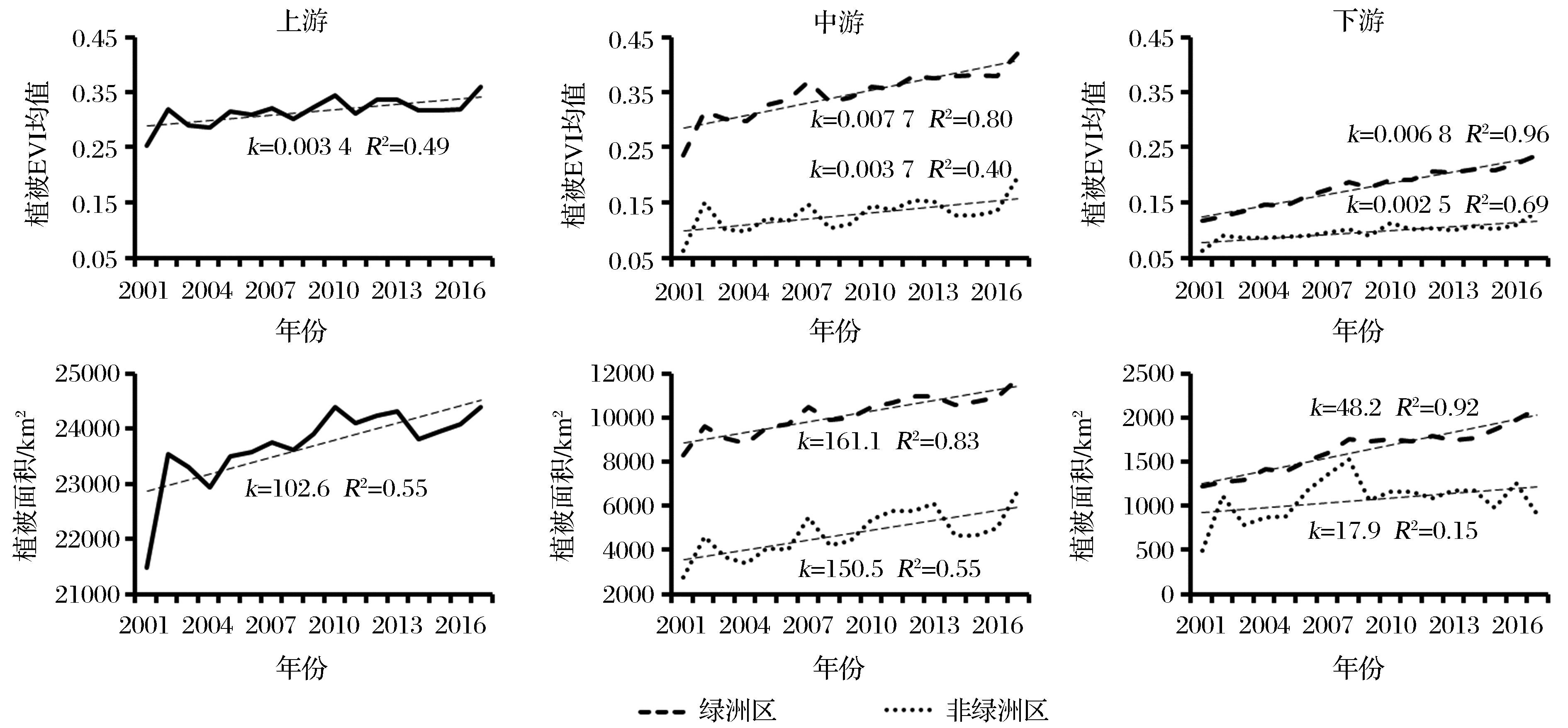 | 图4 2001~2017年黑河流域上中下游植被年最大EVI值与覆盖面积的变化趋势 |