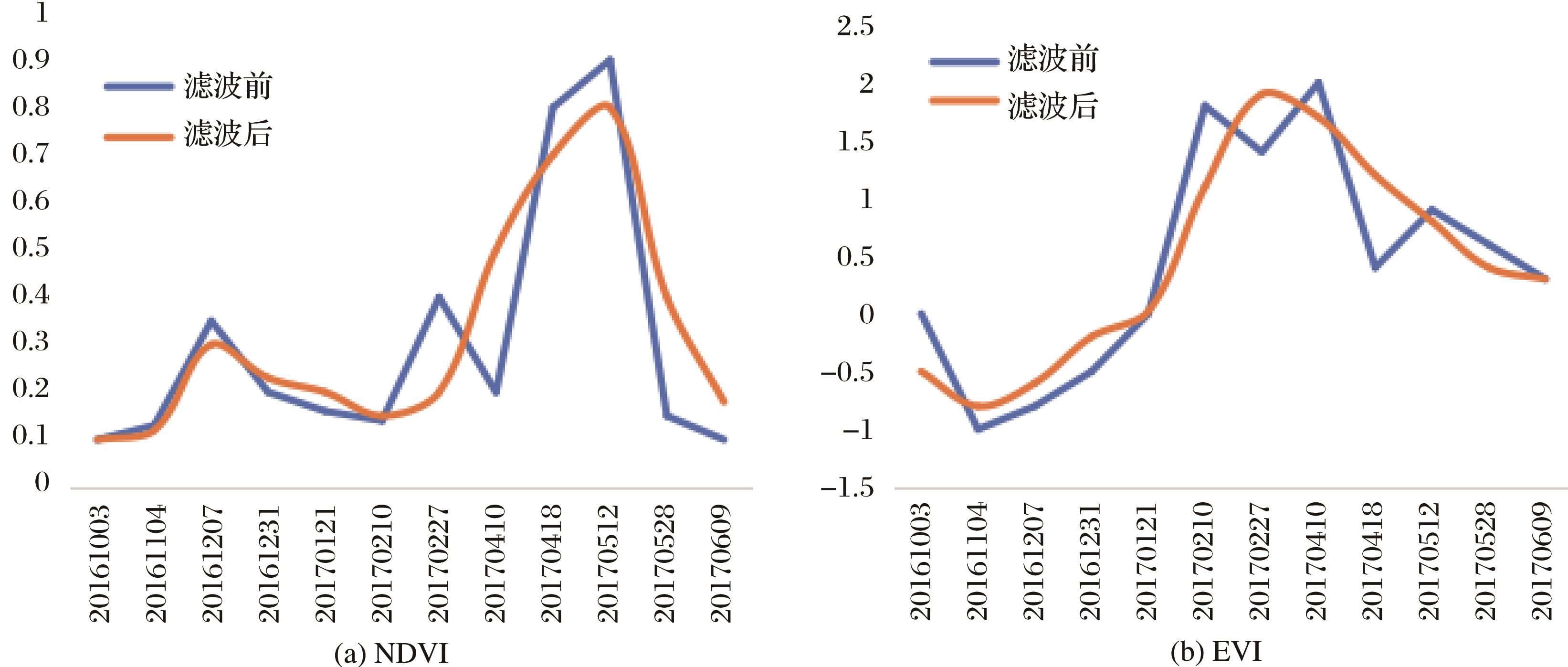 | 图3 滤波前后的冬小麦GF-1时序曲线对比 |