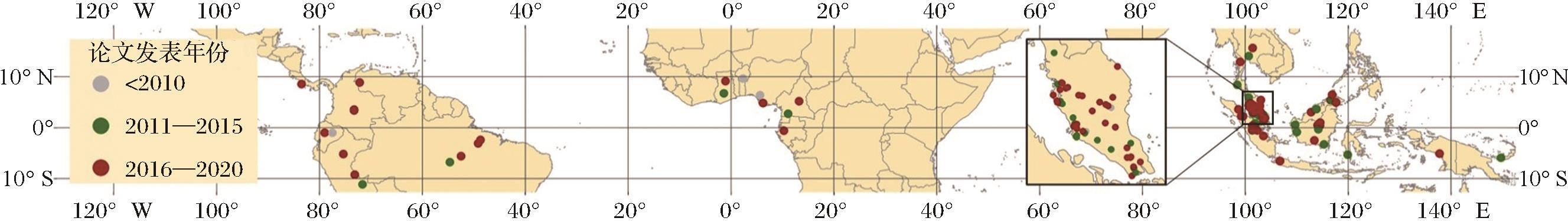 | 图1 不同时间段油棕研究的空间分布情况 |