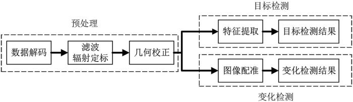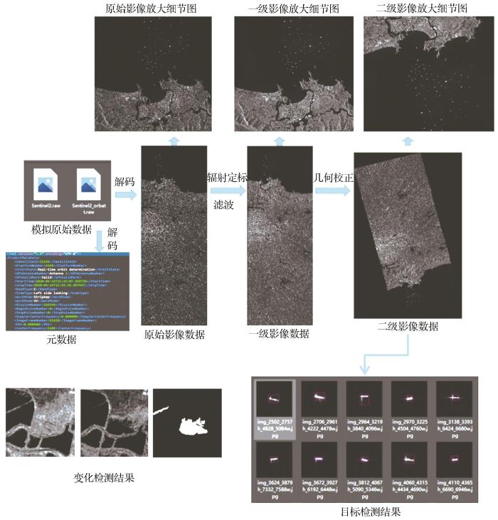 实时星上处理算法设计流程如图4 所示,从图像采集模块获得目标遥感影像后,首先对目标遥感影像进行解码处理,得到原始遥感影像数据,同时也得到该目标遥感影像数据对应的元数据;然后对原始遥感影像数据进行滤波处理以及辐射定标处理,将图像的亮度灰度值转换为绝对的辐射亮度,得到一级遥感影像数据;得到的一级遥感影像数据可能因大气折光、地形起伏等因素导致影像的几何位置、形状等特征与对应的地面特征存在区别,所以需要再对一级遥感影像数据进行几何校正处理,以得到二级遥感影像数据;最后根据用户预先的设定,进行目标检测或变化检测处理,根据需求确定下传数据内容并将仿真结果下传至地面测控系统进行验证。