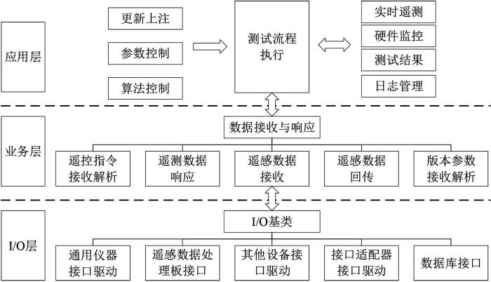 仿真地面测控系统根据层次结构划分,采用3 层架构设计,即应用层、业务层和 I/O 层,层次结构如图5 所示。应用层向测试人员展示各种交互界面,测试人员通过界面对系统结构以及测试流程进行操作控制,并通过业务逻辑层来进行相应的操作,同时负责维护登录数据库的用户权限;业务层负责处理数据层的数据,实现业务逻辑,包括解析遥控指令逻辑、遥测数据逻辑、遥感数据处理板任务管理逻辑; I/O 层封装了各类测试资源的接口及驱动。