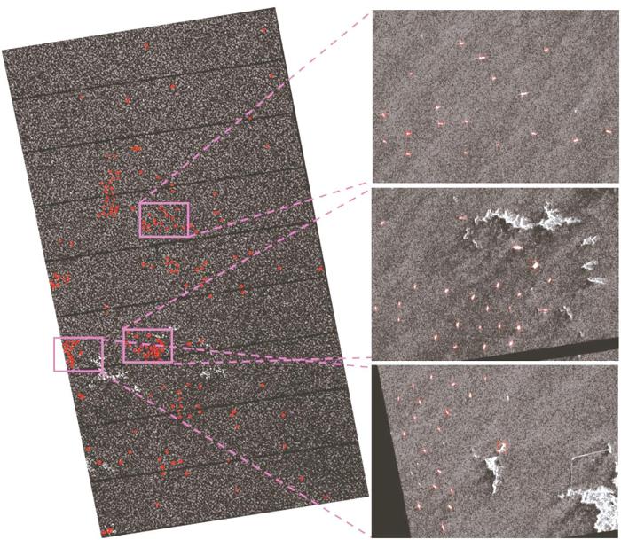 ... 本系统验证的星上处理流程[19 ] 如图13 所示.在此次验证中,通过图像采集模块生成模拟影像进行星上处理仿真验证.以舰船为检测目标,图14 为模拟SAR影像的目标检测结果,图15 为检测目标位置信息输出结果,主要内容包括所检测到的目标总数、目标的图像坐标以及经纬度坐标. ...