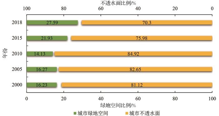 2000年以来,呼和浩特市区内不透水面比例较高,总体上呈现先上升后下降的特征。呼和浩特市注重绿色生态发展,在城市周边及城市内部开发建设了多个绿地公园,且更加注重人工硬化与绿地的有效镶嵌,总体上,城市绿地空间比例呈现波动上升的特征(图5 )。分时段来看,2000年呼和浩特市区不透水面面积在城市土地面积中的占比为81.12%,绿地空间面积占比为16.23%。2005年城市不透水面比例与城市绿地空间比例均有所上升,分别增长到82.65%和16.27%。2010年城市不透水面比例持续上升到84.92%,同期,城市绿地空间比例下降2.14个百分点。比例下降原因归结为2000—2010年期间,呼和浩特市注重城市扩展与开发建设,因此城市土地面积与不透水面面积大幅增加,导致城市绿地空间比例有所降低。2010年后呼和浩特市开始注重城市生态与景观建设,一定程度上增加了城市绿地空间面积,到2015年,城市绿地空间比例增长到21.93%,而城市不透水面比例下降到75.98%。到2018年,城市绿地空间比例持续上升到27.59%,城市不透水面比例下降至70.30% (图6 )。