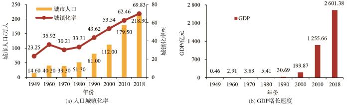 建国70年来,呼和浩特市人口城镇化率从1949年的23.25%上升到2018年的69.83%,呈波动上升趋势;城市人口从1949年的14.60万人增长到2018年的218.30万人,总体上呈现稳定增加趋势(图7 (a))。呼和浩特市区城市扩展速度曲线与城镇化率曲线呈现较高的相似性。随着城镇化进程的加快,大量人口聚集到城市,导致对城市住房、基础设施等方面的需求日益增加,固定资产投资中房地产投资、基本建设投资占比不断提升,由此引起城市建设用地不断扩展。人口的增长带动了经济的增长,1949—2018年呼和浩特市GDP从0.46亿元上升到2601.38亿元。地区GDP增长速度呈现逐渐加快的趋势,增长速度从1949—1960年的0.22亿元/a上升到2010—2018年的168.22亿元/a。21世纪以来,随着西部大开发战略的实施及对外开放程度的提高,同时受中国加入世界贸易组织的影响,呼和浩特市GDP增长速度明显加快,呈“指数型”增长(图7 (b))。经济的发展带动了产业结构的不断优化,从而导致更多的产业聚集到城市,用地需求随之不断增大。