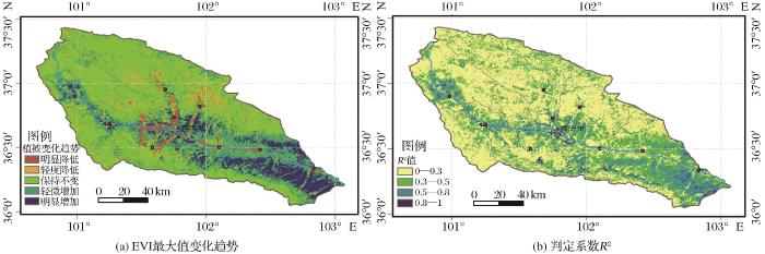 湟水流域2000—2019年年EVI最大值变化趋势分布图与判定系数R 2 分布图