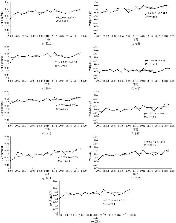 2000—2019年湟水流域上中下游9个县区植被年EVI最大值与变化趋势