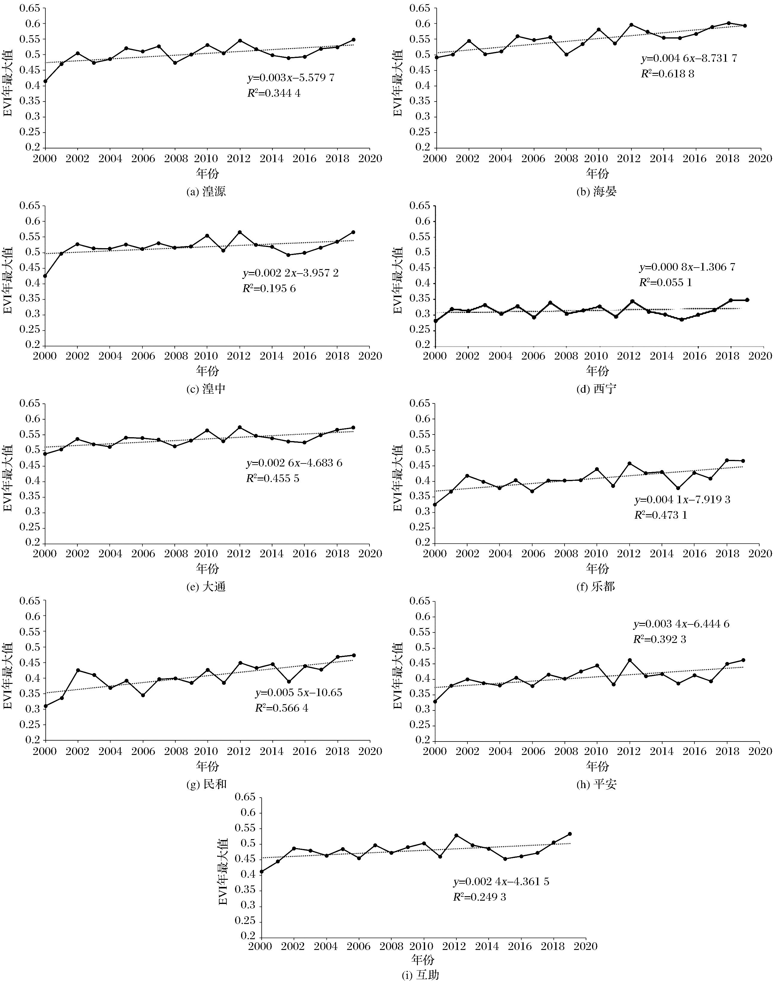 | Fig.4 The change trend of annual maximum EVI of nine counties in Huangshui Basin from 2000 to 2019 |
