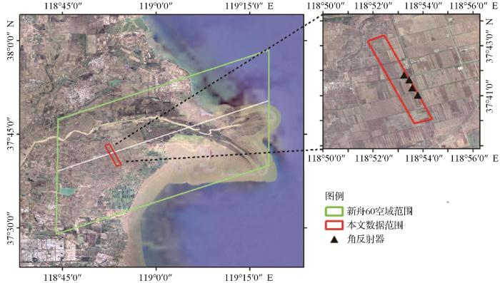 在国家民用空间基础设施陆地观测卫星共性应用支撑平台项目(简称“空基”项目)的支持下,2019年11月10日至25日,中国科学院空天信息创新研究院在山东省东营市组织开展了天空地一体化数据协同获取综合实验,利用新舟60遥感飞机获取了P、L、C及X波段高分辨率SAR数据,并开展了地面数据同步采集工作。东营市位于山东省东北部,黄河入海口的三角洲地带,地表覆盖类型主要为农田、湿地、水体、城镇和裸地等,实验期间植被覆盖主要为冬小麦和盐化草甸。图1 所示为山东东营综合实验范围,其中绿色区域为新舟60遥感飞机测区空域范围,红色区域为本文实验使用的机载SAR数据的覆盖范围,黑色三角形表示角反射器布设位置。