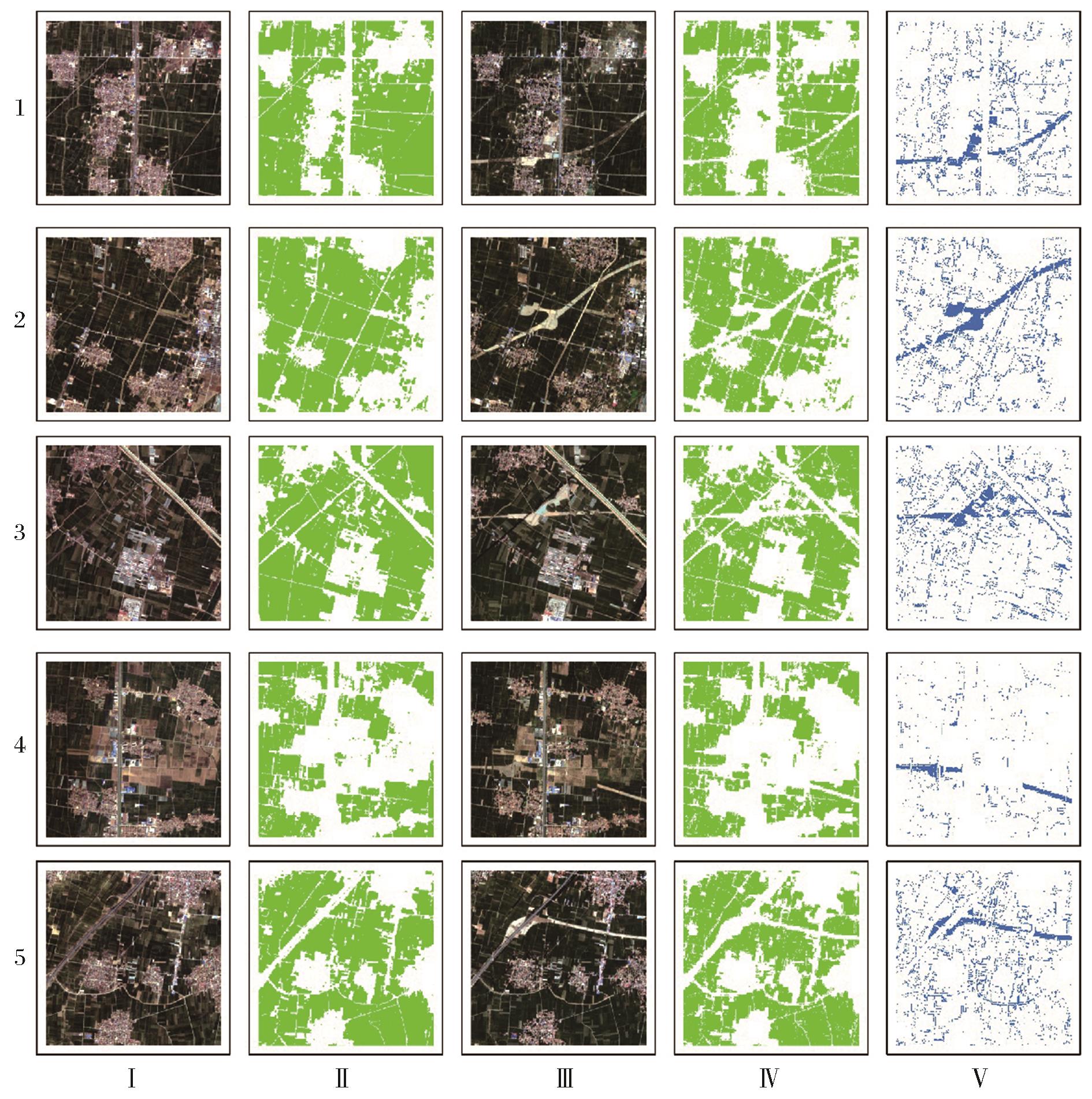 图7 人为活动下冬小麦收获面积缺失图 (Ⅰ-Ⅴ分别代表2019年3月14号Sentinel-2 10 m真彩色影像、冬小麦种植面积分类结果、2019年5月23号Sentinel-2 10 m真彩色影像、冬小麦收获面积分类结果、收获面积相较于种植面积的减少值;1~5则分别代表不同位置的子图) |