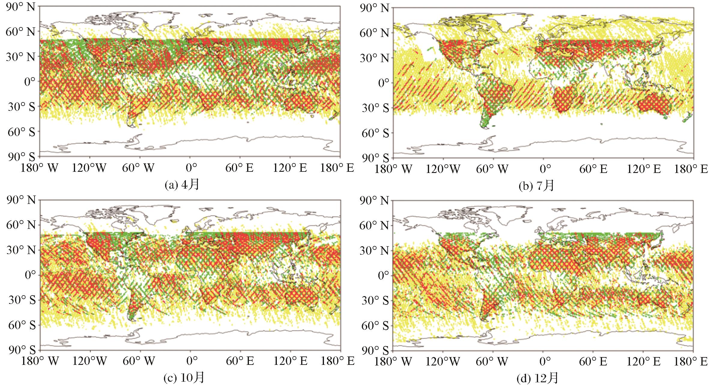 | 图1 2020年4、7、10、12月OCO-2、OCO-3 XCO2覆盖分布 |