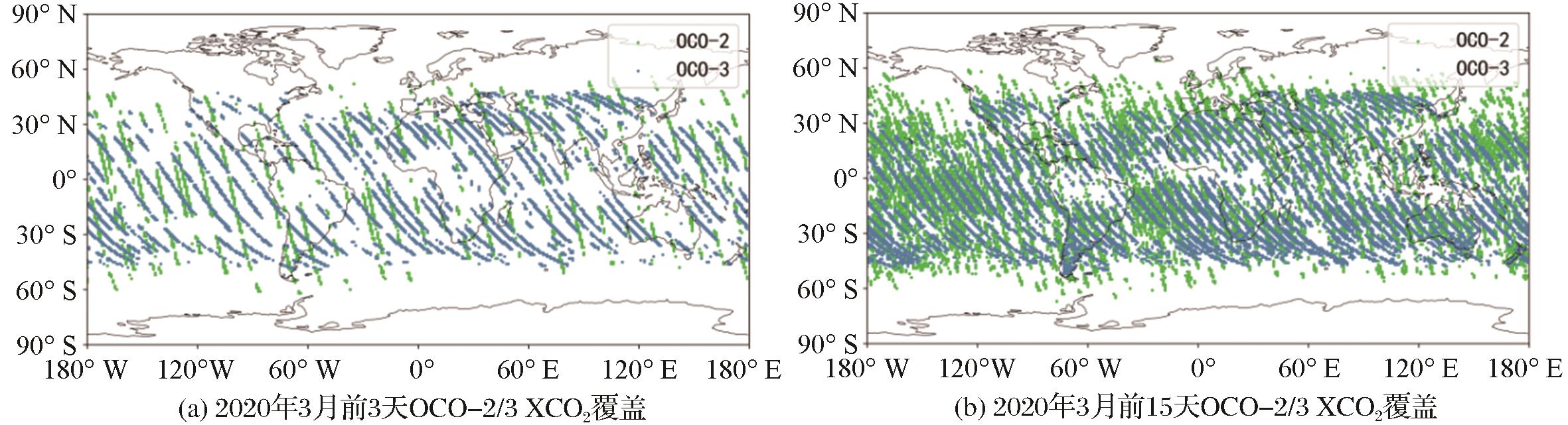 | 图3 2020年3月前3 d、前15 d OCO-2、OCO-3 XCO2覆盖分布 |