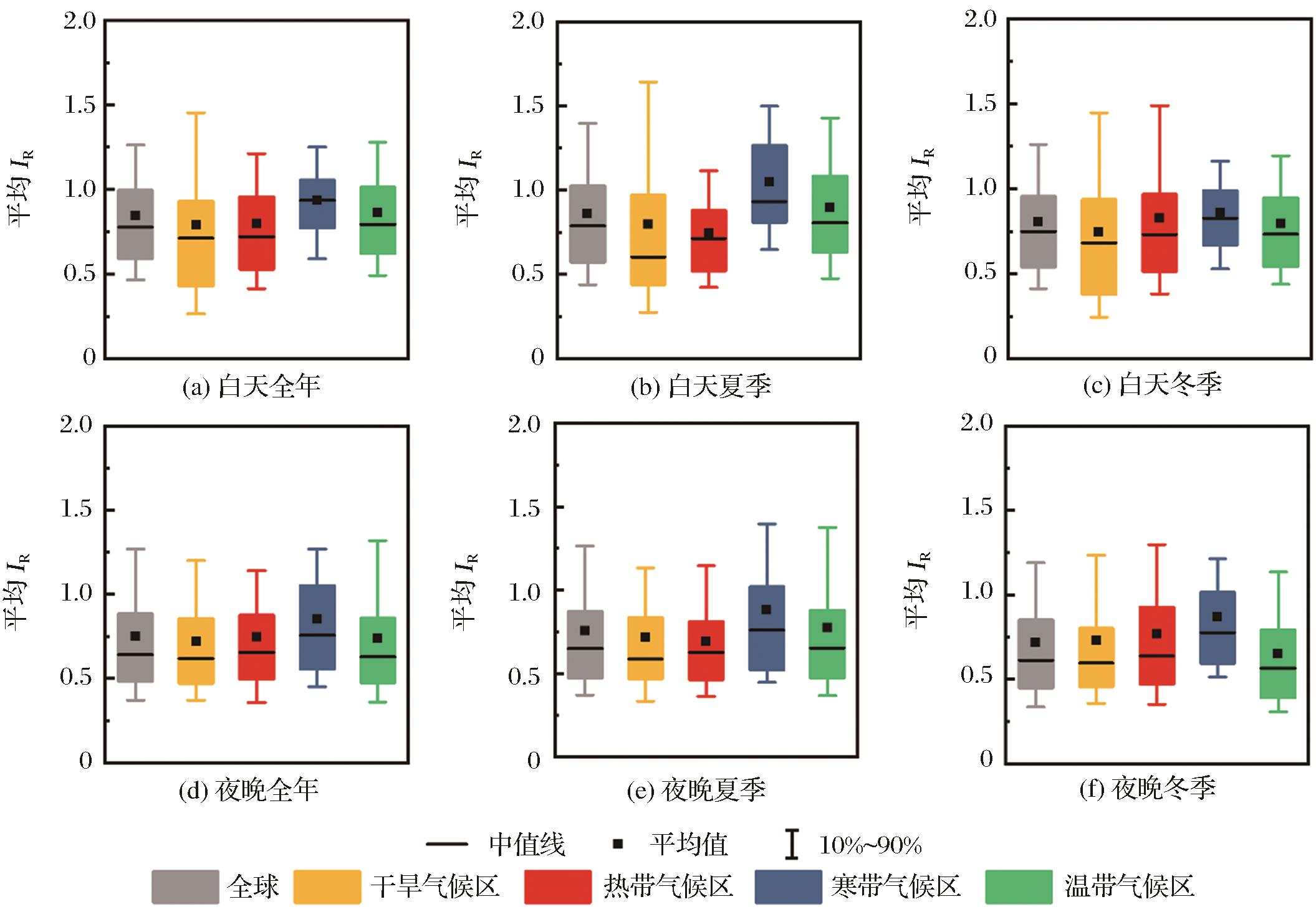 | 图4 全球及不同气候区城市2000~2019年全年、夏季和冬季日夜平均IR |