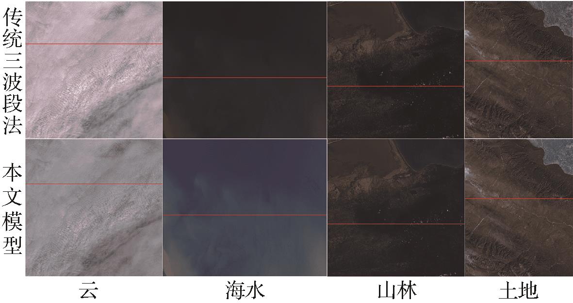 | 图9 Landsat-8 OLI各地物类型三波段法与本文CMFs模型合成真彩色影像对比 |