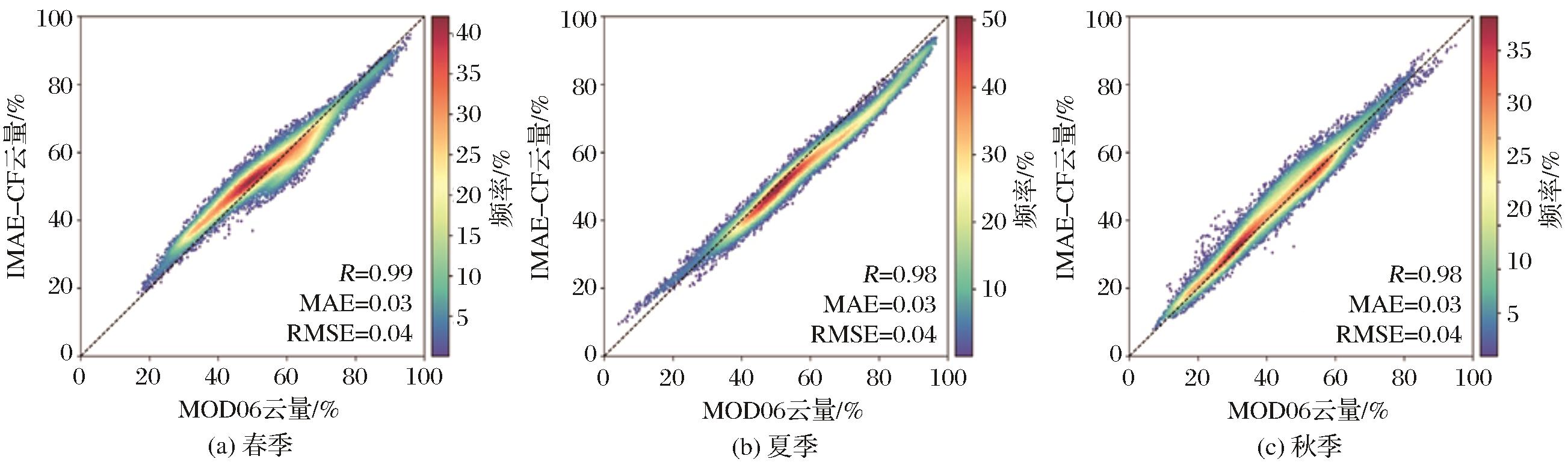 | Fig.10 The density scatter of MOD06 and IMAE-CF in spring, summer and autumn from 2011 to 2020 |