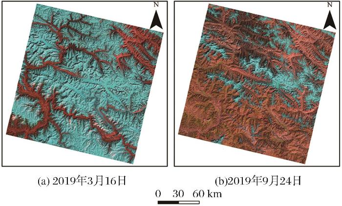 ((b)~(f)列背景图为2019年9月24日Landsat⁃8 OLI影像543假彩色合成图)