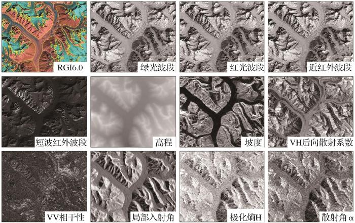 Sentinel-1卫星数据空间分辨率约为10 m,单星重访周期为12 d,A、B两星使时间分辨率缩短至6 d。包括超宽幅(Extra Wide Swath,EW)、干涉宽幅(Interferometric Wide Swath,IW)、条带(Stripmap,SM)和波模式(Wave,WV)等工作模式,数据主要类型格式有原始信号RAW、单视复数产品(Single Look Complex,SLC)和地距探测产品(Ground Range Detected,GDR)。研究表明冰川监测常用C波段SAR遥感数据[13],选用覆盖该区域且时间在Landsat-8 OLI影像时间点附近的4景IW模式,带有相位信息的SLC格式Sentinel-1 SAR数据(表2),经过处理,选择VH极化通道的后向散射系数、主辅影像干涉处理后VV极化通道的相干系数[4]、局部入射角[5]、极化分解[28]后的极化熵H和散射角α作为SAR影像的特征(图3)。将所有数据重采样至同样栅格大小,并进行最大最小值归一化预处理,得到影像栅格尺寸为14 619×13 660像元。