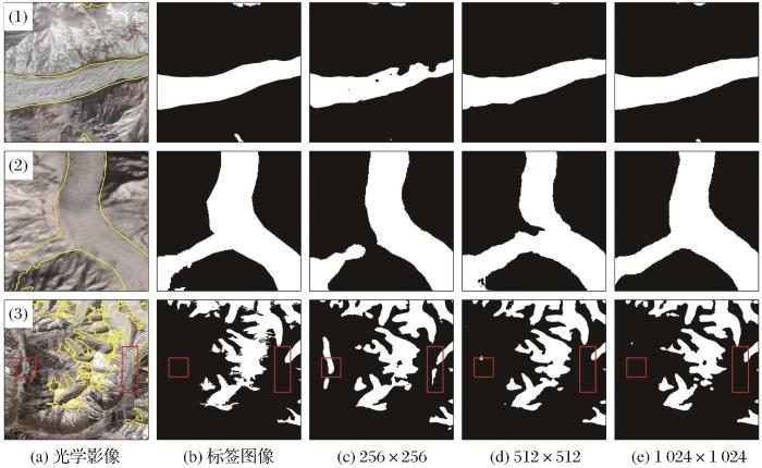 为了探究不同样本尺寸对于冰川识别精度的影响,同时,受限于计算性能和单个样本的数据量,将样本分别裁剪为256×256、512×512和1 024×1 024像素尺寸,进行垂直翻转、对角翻转和图像放大的操作以扩增样本集,以6∶2∶2的比例随机分为训练、验证和测试数据集进行模型训练,得到的各样本尺寸精度见表3。
