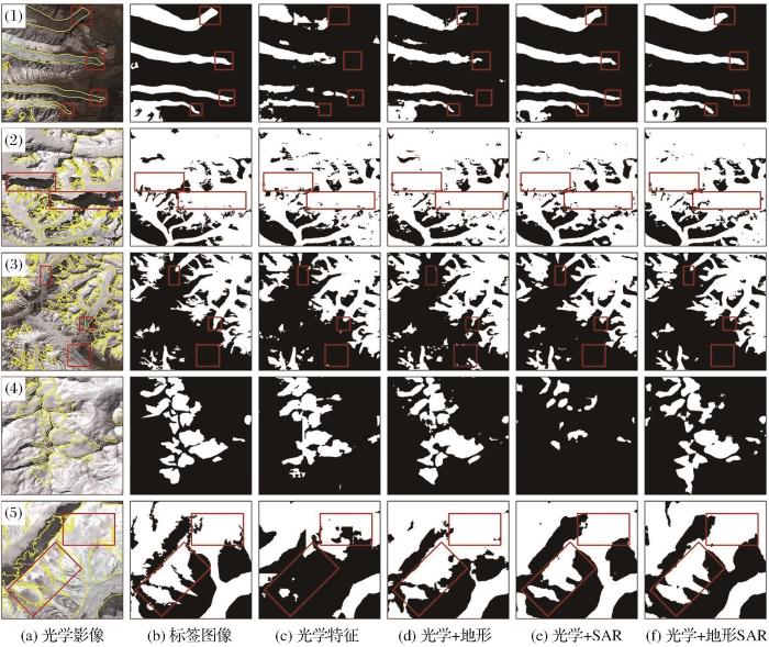 从具体识别效果看,更多维度的特征训练出的模型提取了更为稳健的上下文信息,模型稳定,拼接痕迹明显减少。识别特征越多,对于表碛末端识别错分漏分减少,光学影像上积雪覆盖的表碛区光谱特征仍然与周围裸岩相似因而被错分为非冰川(图10第一行)。同样可以看到山体阴影对于深度学习方法冰川识别基本没有影响(图10第二行),使用VGG19-Unet网络在各种特征组合中也未将积雪融水和结冰湖泊错分为冰川(图10第三、四行)。部分薄云覆盖区域,由于光学影像没有穿透性,云覆盖区域光谱特征与周围冰川存在差异,分类结果中被错分为非冰川区域(图10~5(c))。作为模型输入的训练特征中,光学特征主要用于区分积雪/裸冰与周围裸岩和表碛,地形特征用于区分表碛部分(图3),同时作为阈值约束冰川所处的海拔高度和坡度范围。SAR数据特征中,后向散射系数特征用于判断地表物体的粗糙度、含水量等,双极化特征极化分解得到的极化熵和散射角反映了地物的表面散射和体散射特征。由于冰川(包括表碛部分)的流动性特性,一段时间内会造成干涉相干性降低或失相干结果,冰川轮廓可在相干性图中清晰呈现。这些同类型特征间或不同特征类型间会存在一定的相关性,但和Xie等[16]阐述相同,即使存在较大相关性,但去掉某些特征后精度依然会受到影响。卷积神经网络有能力进行深层次复杂特征提取,但依据先验知识,在网络输入上增加地形和SAR数据类型的特征可以更好辅助冰川识别。有用的后处理可以帮助纠正错误分类,其优势比网络结构修改更能切合具体问题[17],可通过忽略边缘结果预测方法,空洞填充、边界平滑、消除独立像素和独立像素斑块的形态学操作,得到更完善的冰川边界。