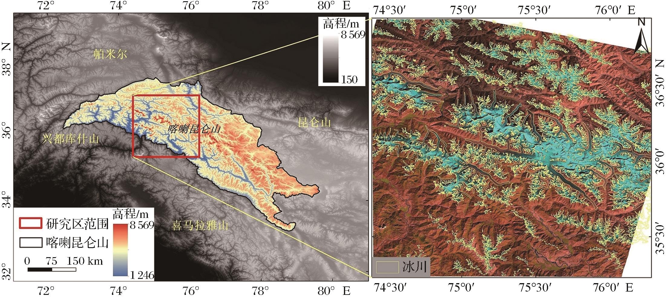 | 图1 研究区地理位置及冰川分布 (右图底图为2019年9月24日Landsat 8 OLI影像654波段假彩色合成,蓝色为裸冰,叠加的黄色矢量边界为RGI6.0数据) |