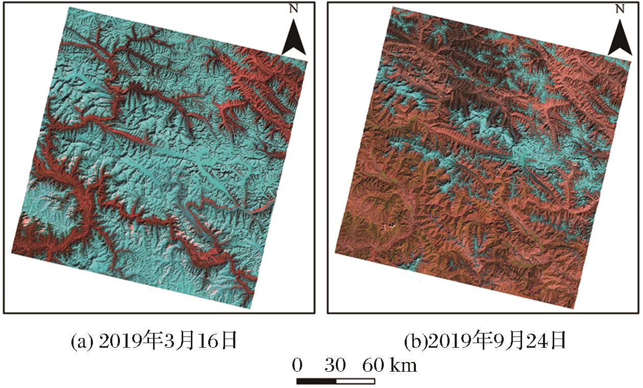 | 图2 2景Landsat-8 OLI影像 (R:SWIR G:NIR B:Red,蓝色为裸冰/积雪覆盖区) |