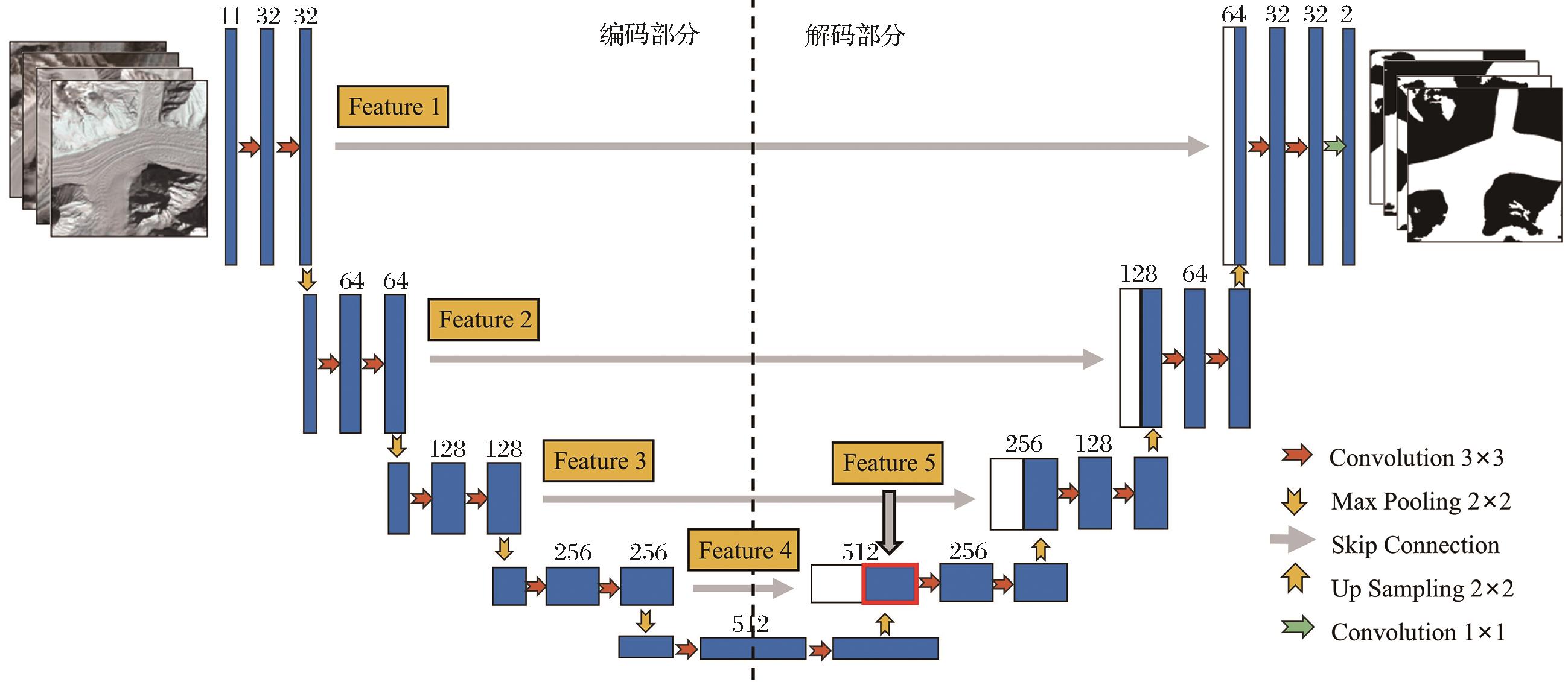 | 图5 U-Net网络结构 (Feature指主干网络输出的,可与U?Net网络解码块跳跃连接的特征块) |