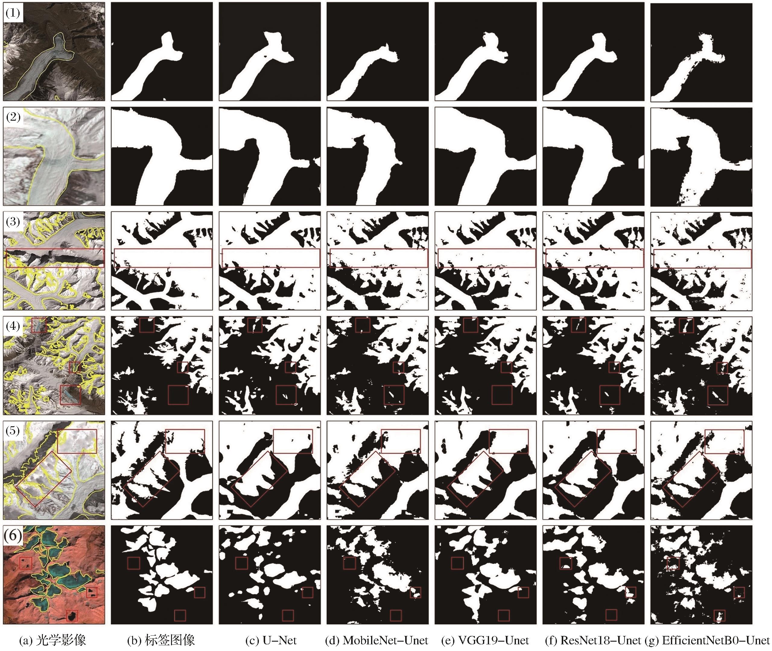 | 图8 基于不同Backbone的U-Net网络冰川分类结果 ((6)背景图为2019年9月24日Landsat?8 OLI影像654波段假彩色合成;第三至六行红色方框分别强调山体阴影、积雪融水、薄雾覆盖和结冰湖泊区域识别效果) |