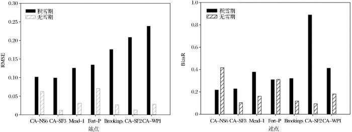 积雪期和无雪期的RMSE和BiasR统计柱状图