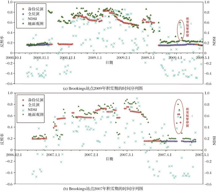 实验为了更加客观地描述卫星反照率产品在积雪期的精度和不确定性,选取的是较高纬度地区的站点,降雪过后积雪不会立刻融化。但许多中低纬度地区在降雪过后积雪会以较快的速度融化(积雪短暂停留)。MCD43A3能否识别出冰雪地表状态,能否准确地描述地表反照率的变化也是值得关注的一个问题。因此,从站点数据中,以地表反照率在融雪期间发生的变化为例来说明MCD43A3对地表动态变化的捕捉情况。以Brookings站点为例,分析了2007年和2009年两处“积雪短暂停留”事件。图4 (a)和图4 (b)显示了地面观测反照率和MCD43A3在降雪和融雪阶段会存在较大的误差。其中2007年红色椭圆内对应的卫星反照率为备份算法反演的反照率,2009年的红色椭圆内为全反演算法生产的反照率。