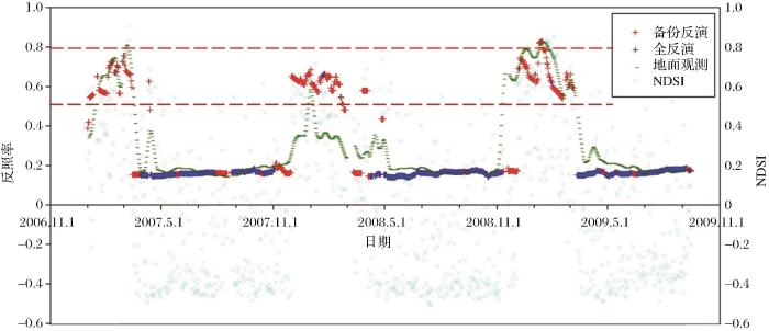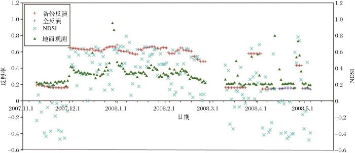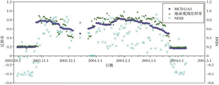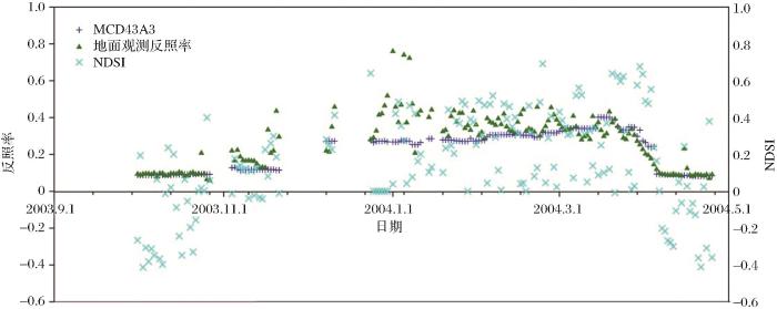 在验证过程中,还用到了MOD10A1冰雪产品数据中的归一化雪被指数(NDSI),综合NDSI、MCD43A3和地面观测反照率值的快速升高和下降的变化,来判定站点的积雪期和融雪期。