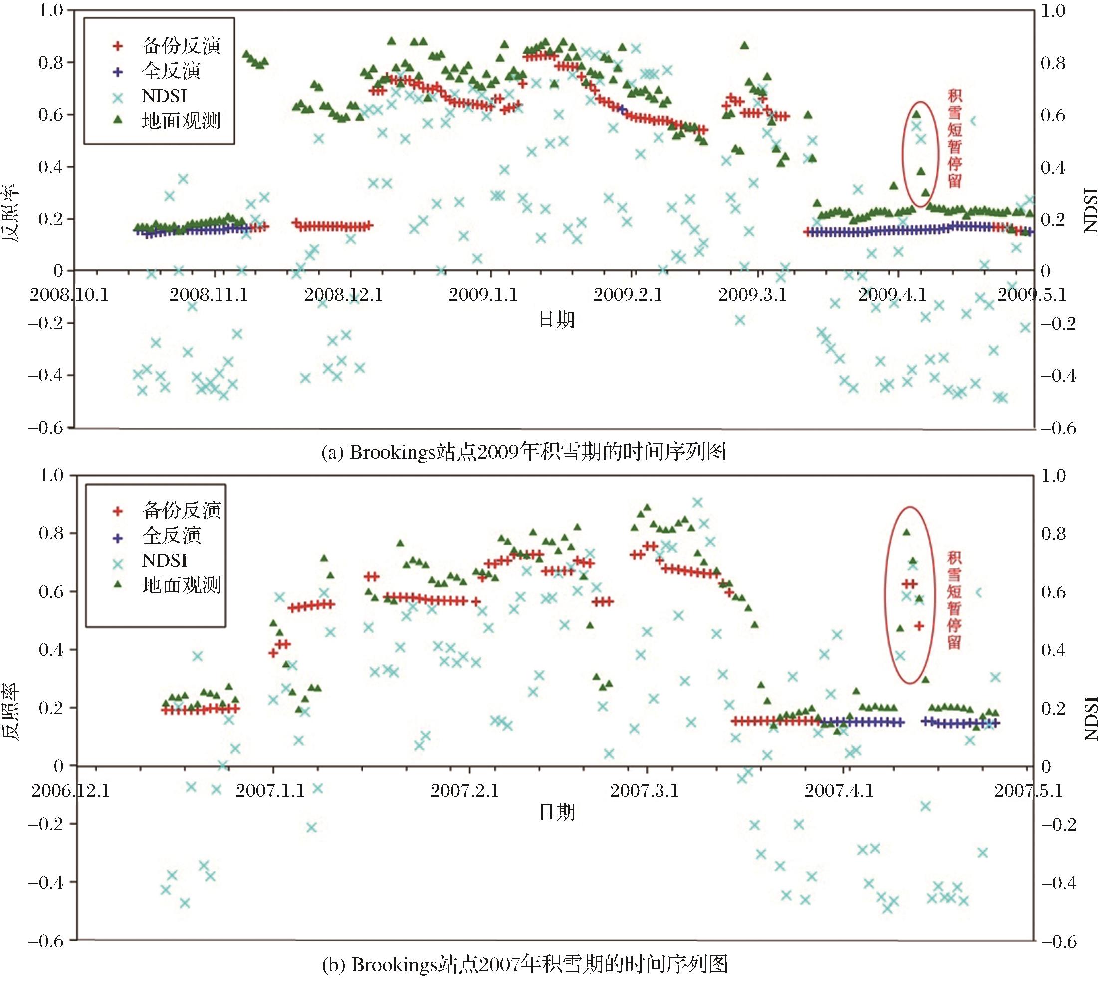 | 图4 积雪短暂停留情况下卫星反照率产品的表现 |