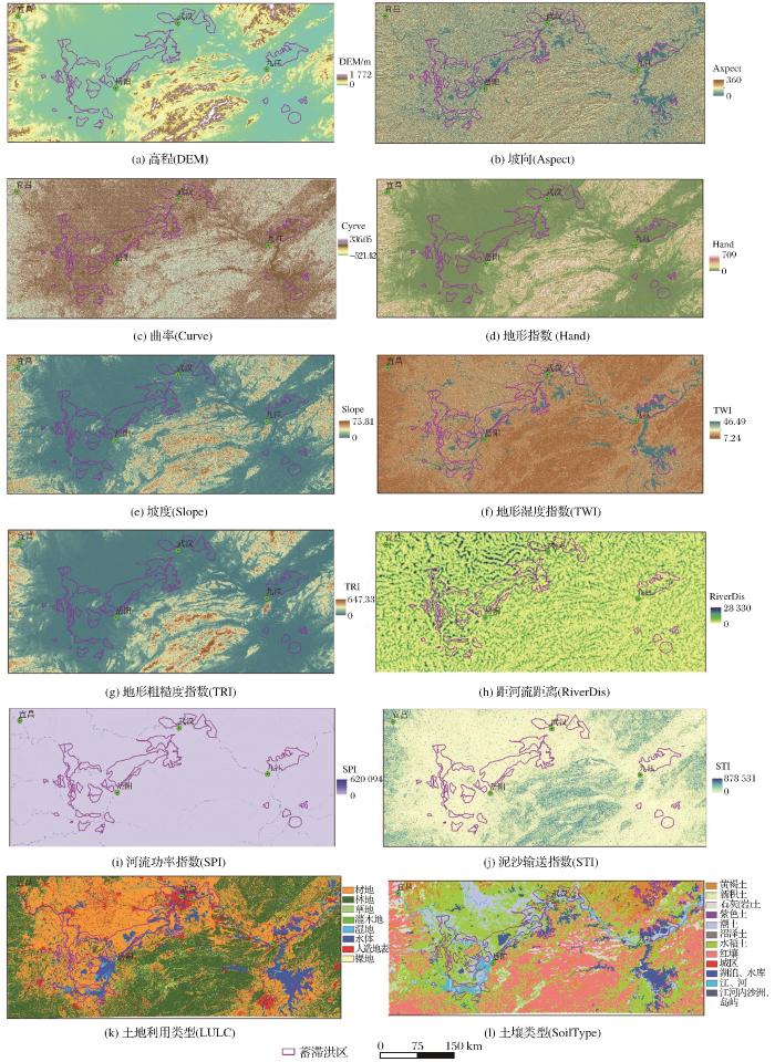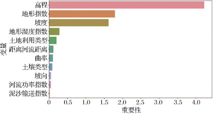 | 变量 | 高程 | 地形湿度 指数 | 地形指数 | 泥沙输送 指数 | 河流功率 指数 | 坡度 | 坡向 | 曲率 | 距河流距离 | 土地利用 类型 | 土壤类型 |
