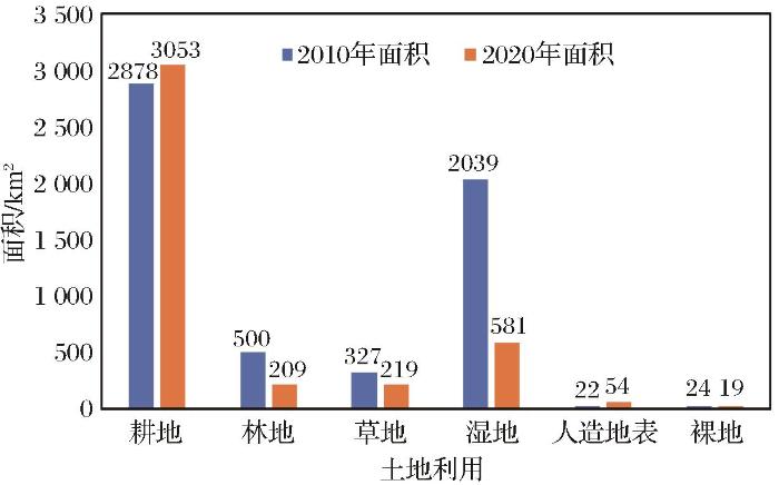 实验通过平水期水体和洪水期两期水体获取洪水分布,具体见图4。经统计分析,研究区平水期水体面积为15 952 km2,而洪水期水体面积达到了22 668 km2,和平水期相比洪水期新增水体面积为6 716 km2,主要分布在洞庭湖、鄱阳湖、洪湖至武汉的长江沿线湖泊水库等原有河湖、坑塘周围地势低洼或相对平坦区域。从新增水体范围内的土地利用来看,新增水体范围内2020年主要土地利用类型为耕地,面积为3 053 km2,占整个新增水体面积的45.42%;其次为湿地,面积为581 km2,占新增水体面积的8.6%。从新增水体范围内2010年以来土地利用变化来看,见图5,耕地、人造地表面积扩大,湿地、林地、草地和裸地面积下降,人造地表面积扩大,湿地萎缩在一定程度上降低蓄水纳洪能力。