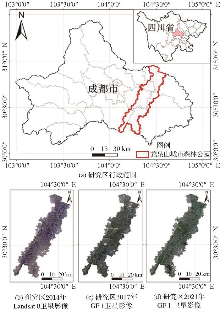 近年来,国内外有关FVC的研究多集中在对长时间序列FVC的制图分析上,少有在分析多时期FVC变化的基础上,结合景观格局的变化对研究区的林相情况进行分析和评价[13]。本研究以龙泉山城市森林公园为研究区,利用龙泉山城市森林公园建设前期(2014年)、建设初期(2017年)和建设后期(2021年)的植被生长旺盛且清晰无云的遥感影像,基于归一化差值植被指数(Normalized Difference Vegetation Index,NDVI)构建像元二分模型(Dimidiate Pixel Model,DPM),分别获取了研究区3个时段的FVC,再通过机载CCD影像提取植被点并进行交叉验证,最后结合景观格局指数对FVC的时空变化特征进行统计分析[5]。在量化分析FVC与景观格局指数的基础上,以期对龙泉山城市森林公园和川中丘陵区的生态建设和环境保护有所借鉴,为可持续发展思想及成都市创建城市绿心奠定理论与实践基础,在森林生态价值转化等方面建成示范样板,形成可复制、可推广的经验[1]。