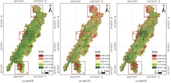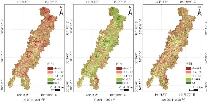 研究区2014年、2017年和2021年的FVC分布图(图3)显示,Ⅴ分布在研究区中部往西南方向延伸区域,Ⅰ分布于研究区边缘区域,多为湖泊河流与村落等建设用地。研究区内3期平均FVC分别为0.757 6、0.665 2、0.706 0,2014年FVC均值水平最高,2021年次之,2017年最低,其变化趋势与2017年开始针对龙泉山城市森林公园植被破坏严重进行生态保护建设情况相吻合。