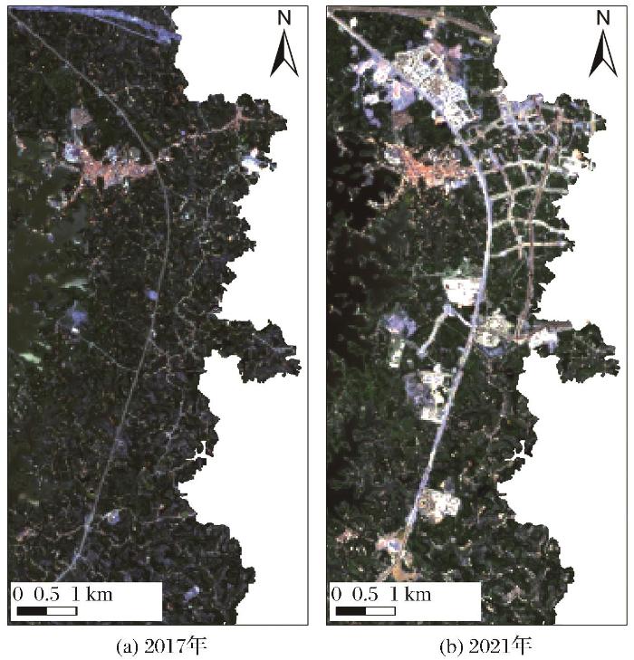 由于研究区常年云雾较多,为获取云量少于5%的影像,研究所用的三期数据分别为2014年8月13日的Landsat-8 OLI影像,通过中科院地理空间数据云下载,空间分辨率为30 m;2017年7月10日与2021年8月2日的高分1号WFV影像,通过陆地观测卫星数据服平台下载,空间分辨率为16 m,具体参数见表1。