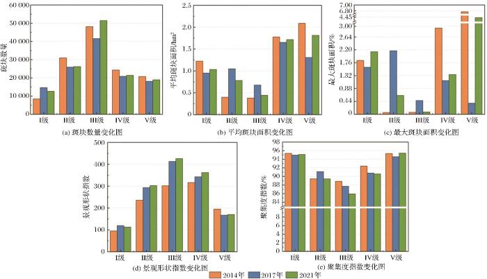 斑块数量NP与平均斑块面积MPS均能部分代表景观破碎化程度,MPS增大、NP减小斑块破碎度降低[27]。但由于各等级的FVC面积之间存在着相互转移的关系,会造成两者变化趋势不一定完全相反的情况。从图7(b)中可以看出,三期影像的Ⅲ的MPS在2014~2021年间一直维持在最小水平,表明其受人类活动影响较大,破碎程度较高。在2014~2017年间Ⅱ与Ⅲ破碎度下降,Ⅰ、Ⅳ与Ⅴ破碎度上升;而在2017~2021年间破碎度变化呈现出相反的趋势,除Ⅱ与Ⅲ破碎度加剧外,Ⅰ、Ⅳ与Ⅴ的破碎度均呈现下降趋势,Ⅴ破碎度下降程度最为显著。结合NP数据可以得出,2017年后研究区景观破碎程度整体呈下降趋势,人类活动影响减弱,生态环境有所改善。