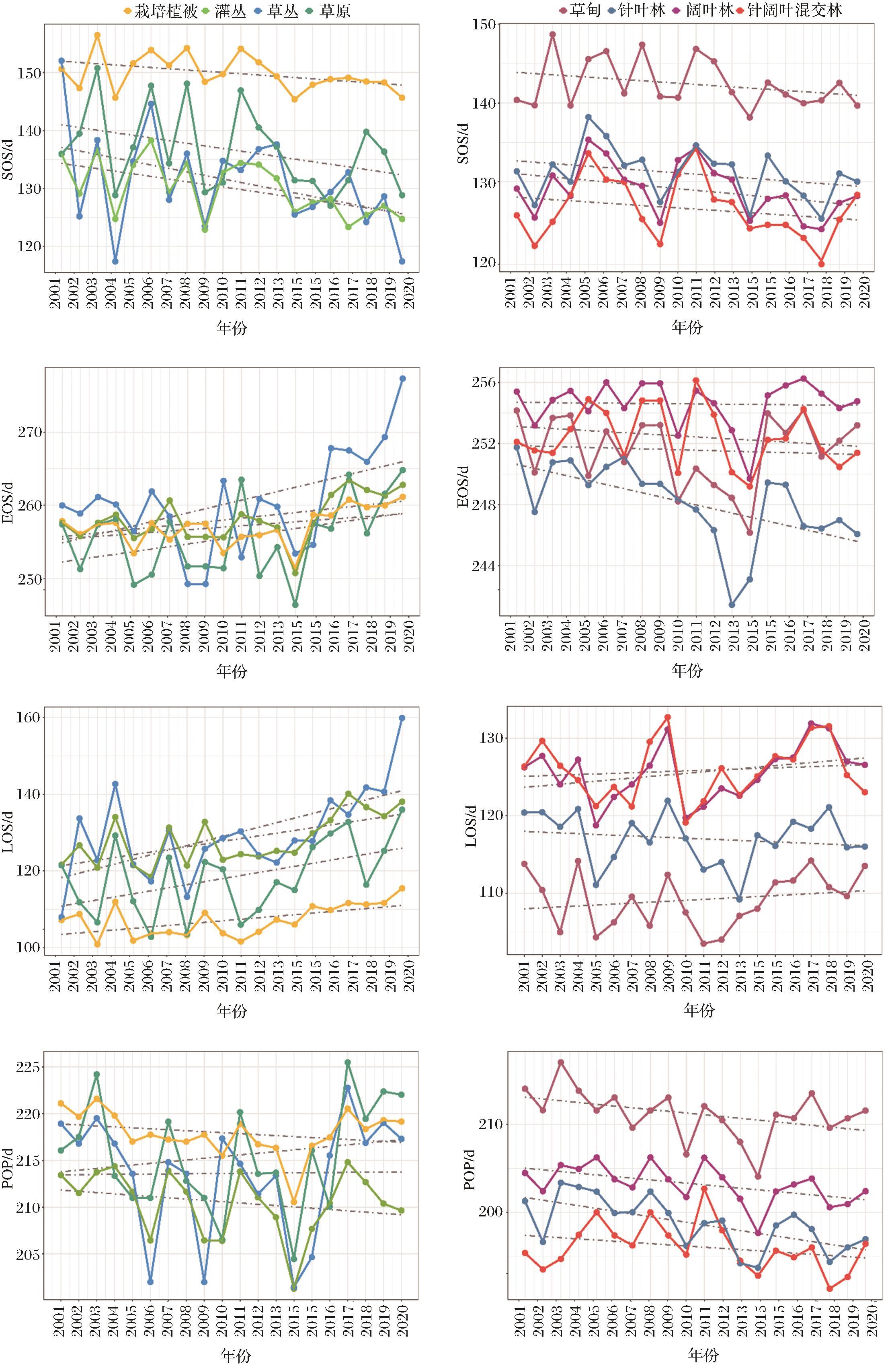 | Fig.5 Interannual changes of phenology of different vegetation in NortheasternChina during 2001~2020 |