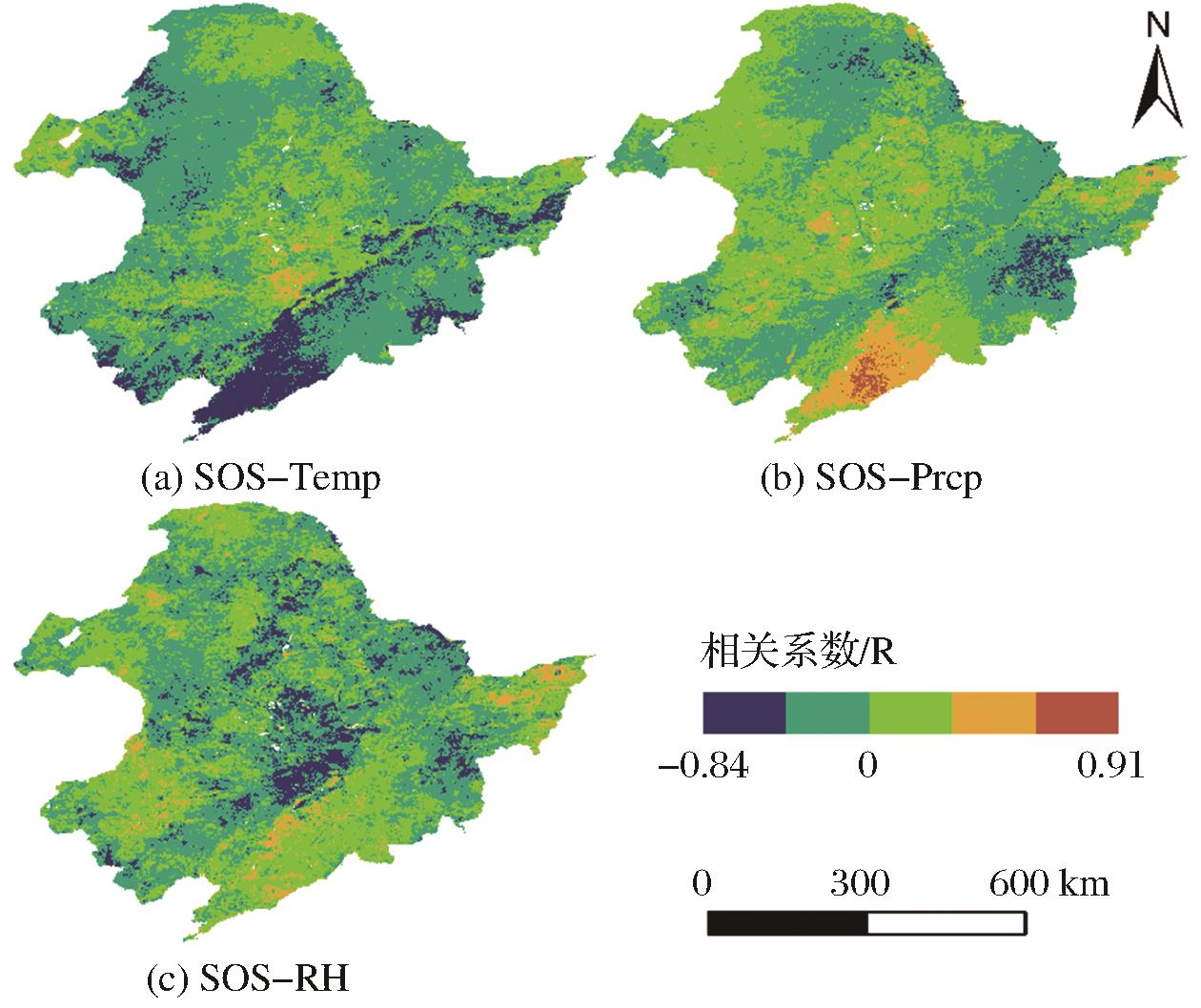 | Fig.11 Distribution of correlation coefficient between SOS and climate in Northeastern China from 2001 to 2020 |