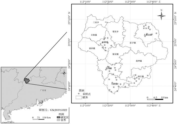 连州市(112°07′~112°47′E,24°37′~25°12′N)位于广东省清远市,地形以山地为主,平原较少,属于典型的山区。全市土地面积为26.69万hm2,耕地面积仅占16.87%[11]。连州市地处亚热带季风气候区域,全年受季风气候影响较大,气候条件优良,水源充足,使得农业化发展较快,从而在一定程度上造成了局部地区农业过度施用化肥。同时,非金属矿开采所带来的废弃物排放,造成地区内有大量重金属累积于地表,因此土壤重金属污染成为重要的研究课题。