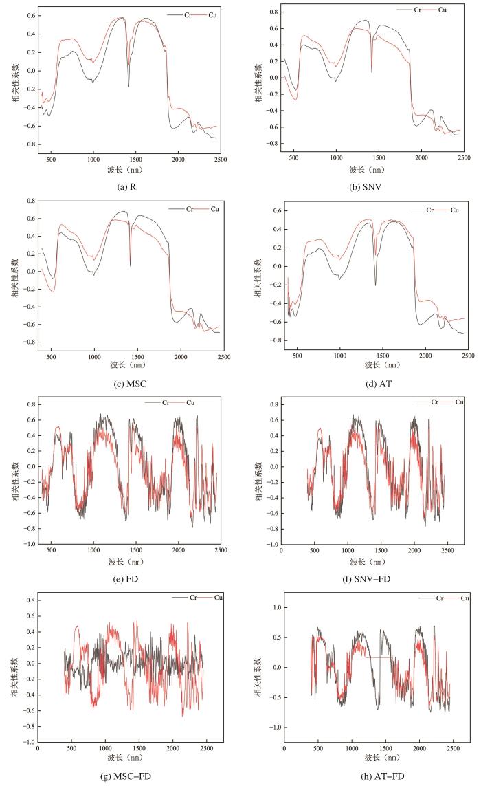 由图3可知,原始光谱(R)与土壤中的Cr、Cu含量的相关系数图中,几个极值点出现在500、1 090、1 400、2 200 nm附近,与土壤反射吸收特征所在的位置相吻合。Cr、Cu与原始光谱相关性的变化趋势来看,其相关性基本呈现出正相关,且两种重金属元素与原始反射光谱相关性曲线的形状、趋势基本一致。Cr、Cu元素实测值在经过一阶微分变换后,曲线相关性在正负之间频率加快,Cr元素相关性较强的波段出现在450、750、1 200、1 500、2 000、2 200 nm附近,Cu元素相关性较强的波段出现在450、600、1 100、1 500、1 900、2 300 nm附近;Cr、Cu元素在经过标准正态变量校正之后,波段650、1 400、1 600、2 300 nm附近相关性较强;Cr、Cu元素经过多元散射校正后,Cr元素相关性较强的波段出现在550、1 350、1 500、2 100、2 300 nm附近,Cr元素相关性较强的波段出现在600、1 200、1 500、2 300 nm附近;Cr、Cu元素实测值在经过对数变换之后,在450、1 650、2 150、2 300 nm波段附近相关性较强。Cr、Cu元素经过多元散射校正、标准正态变量校正、对数变换、一阶微分变换后相关性显著提高,且曲线的趋势和形态不再呈现出单一的变化形式,可以更好地突出土壤中重金属的光谱反射特征。但单一的数学变换对于特征波段的突出还是比较局限,因此采用两种数学变换相组合的形式,以突出更多的光谱信息。将原始光谱经过标准正态变量校正、多元散射校正、对数变换分别与一阶微分相结合变换之后,其相关性相较于单一的数学变换有了明显的提升,频率加快,且正负相关性加大。