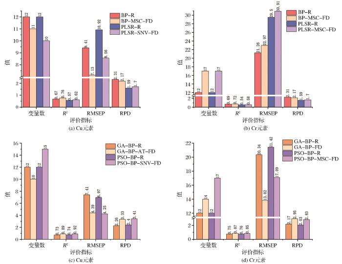 PSO-BPNN、GA-BPNN模型对于土壤中Cr、Cu元素的预测结果如图4(c)、图4(d)所示,相较于原始光谱,预处理之后的光谱使模型的预测效果显著提高。将多种数学变换及其组合形式的光谱处理结果应用到模型中,提取出效果最好的变换方式。Cr元素仅使用一阶微分变换且用GA-BPNN回归模型预测的R2和RMSE分别为0.87和13.82,较MSC-FD变换且用PSO-BPNN回归模型预测的R2和RMSE使得模型更稳定,能够更好地表征Cr元素的光谱响应信号。同时,GA-BPNN模型对于Cr元素预测结果的相对分析误差(RPD)为2.95,高于PSO-BPNN模型的2.83,模型的预测效果更好。Cu元素使用优化之后的BP神经网络的效果好于仅使用BP神经网络预测结果。从两个优化之后的模型中分别提取出的Cu元素最佳处理方式,结果表明使用SNV-FD光谱变换的PSO-BPNN模型对于Cu元素预测效果最好,R2达到了0.92,RMSE为4.25,同时RPD的值超过3.0,模型的预测效果极好。
