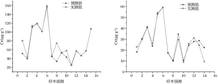 经过上述对比之后,得到研究区土壤中Cr、Cu元素的最佳预测模型,分别为FD-GA-BPNN和SNV-FD-PSO-BPNN。为了验证模型的预测效果,将重金属元素的预测结果与实测结果进行对比,如图5所示,横轴代表样本个数,纵轴代表元素含量。图5(a)、图5(b)中分别将Cr元素15个样本、Cu元素14个样本的实测值和模型预测值进行对比,实测值和预测值的折线基本吻合,表明模型的预测结果较好。经过算法优化之后的神经网络相较于线性模型能够更好地表征Cr、Cu元素的响应信号,同时可以在一定程度上减少噪声对于数据建模的影响,并且使用特征波段提取算法能够对光谱数据高效降维,降低了模型复杂度,从而提高了模型的反演精度。