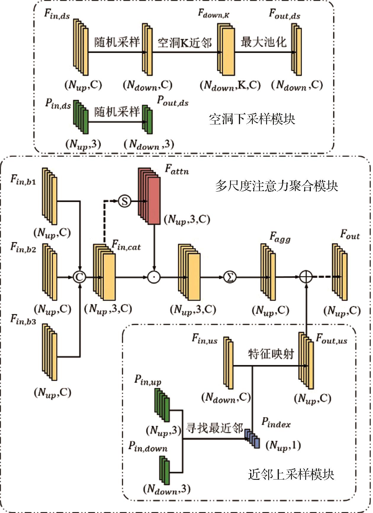 Structure of dilated down-sampling module, nearest neighbor up-sampling module and multi-scale attention aggregation module