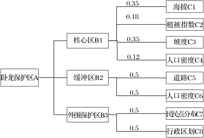 | 卧龙保护区(A) | Ⅰ核心区(B1) | 海拔(C1) 植被指数(C2) 坡度(C3) 人口密度(C4) |