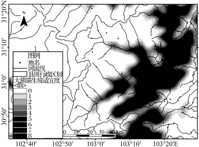 | 坡度 | 大熊猫主要栖息在坡度较缓的地区,本研究中划定50°以下的范围均为适宜区 |