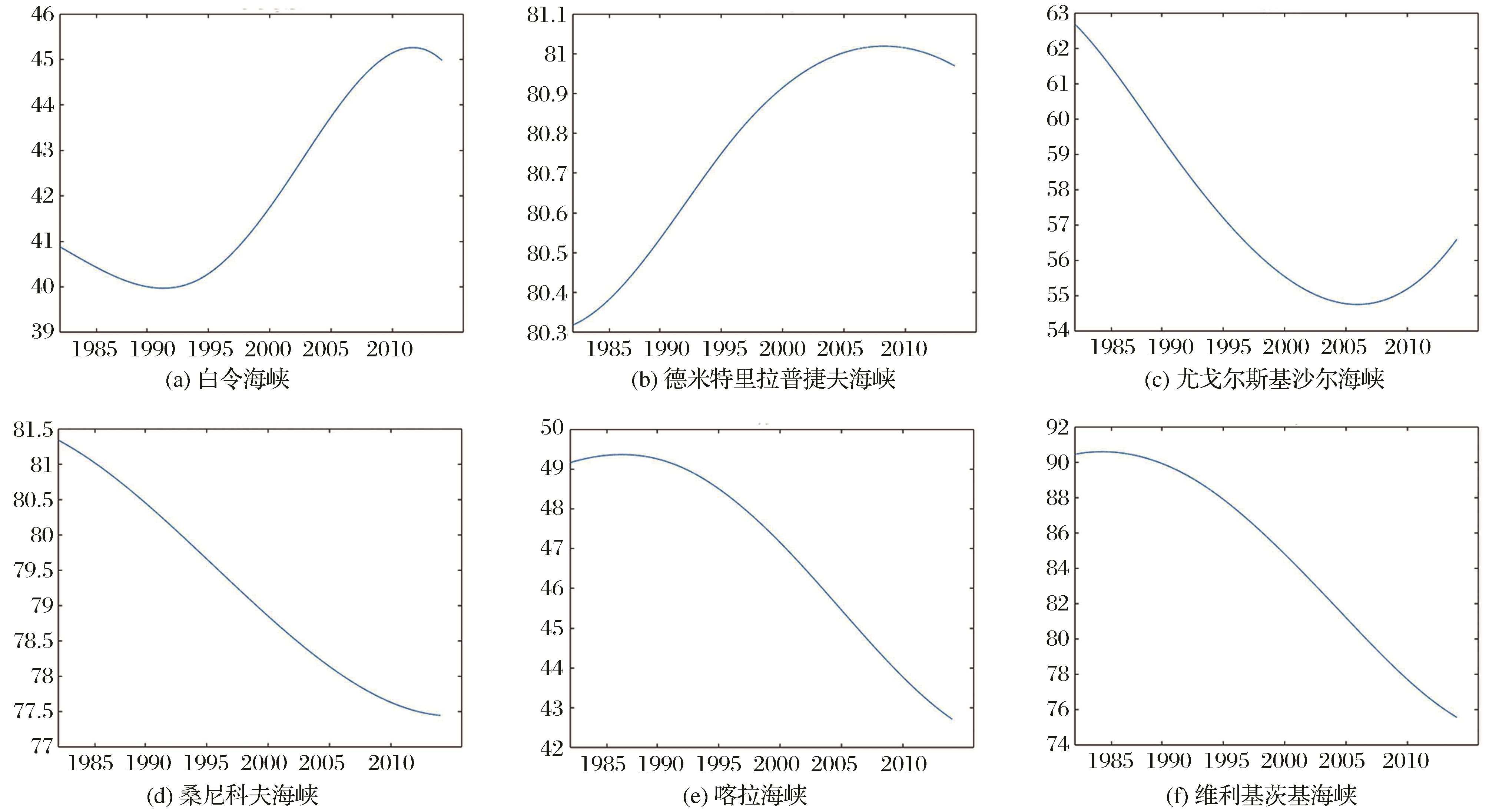 | 图4 东北航道重要海峡近35 a来海冰密集度变化趋势 |