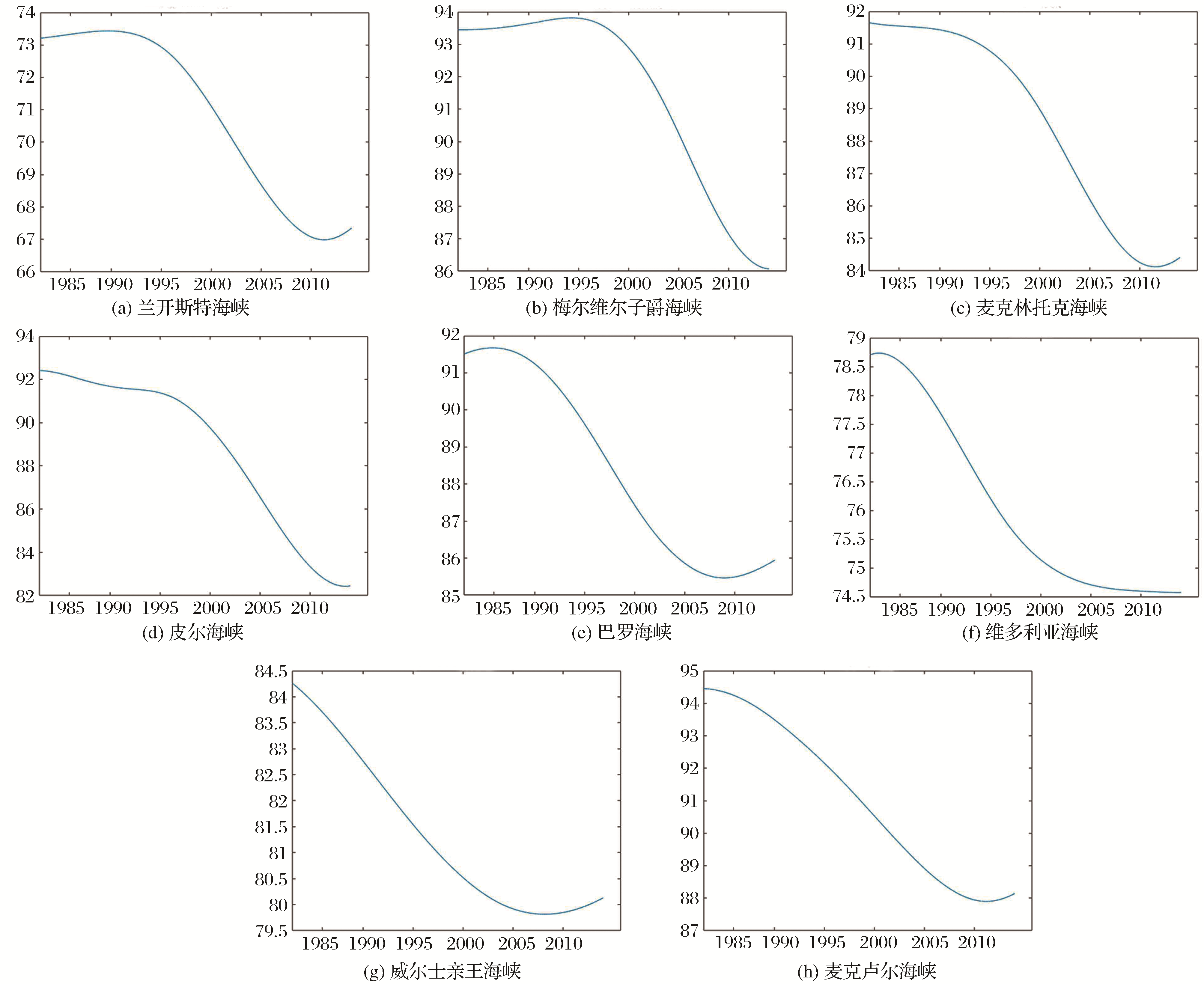 | 图5 西北航道重要海峡近35 a来海冰密集度变化趋势 |