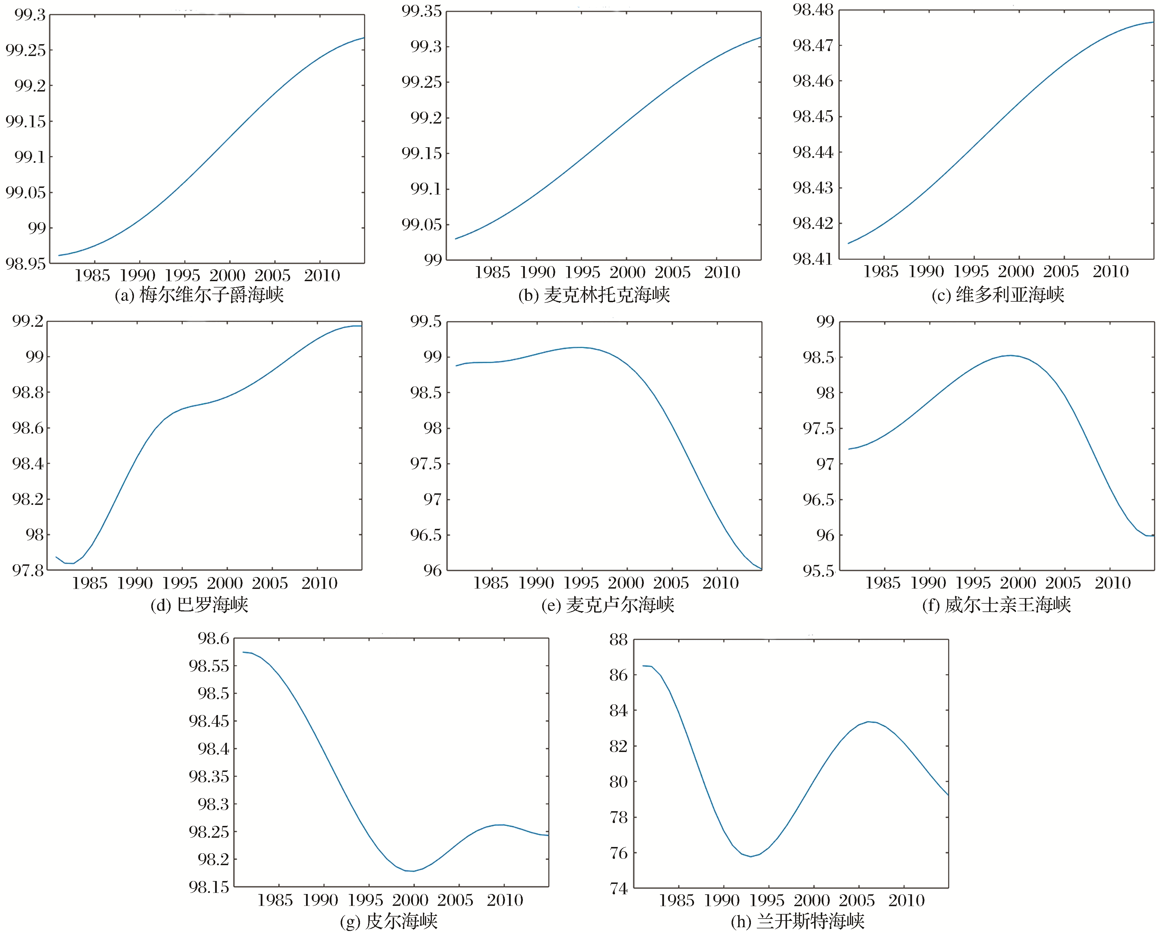 | 图7 西北航道重要海峡近35 a来海冰密集度变化趋势 |