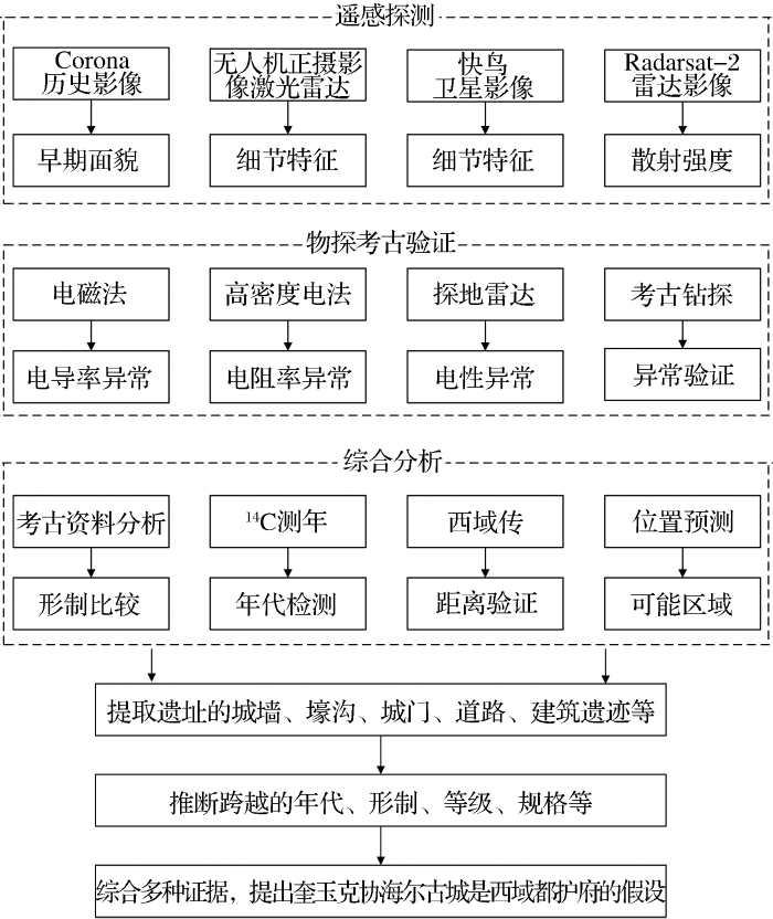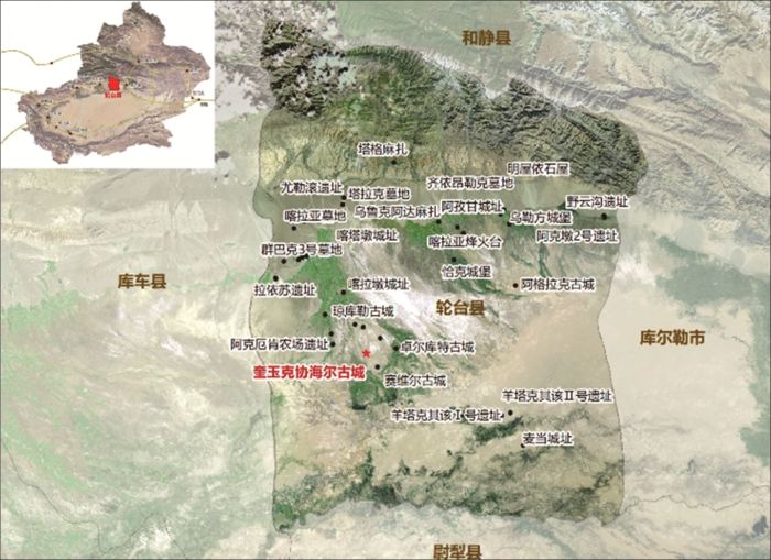 ... 对于西域都护府的位置,学界有着不同的看法,清代学者徐松在《罗布淖尔所受水下》中认为乌垒城位于策大雅乡和库尔楚乡之间的山前平地上[4].瑞典考古学者贝格曼[5]认为是在车尔楚(今库尔楚),黄文弼认为在野云沟[6],林梅村则认为在如今的奎玉克协海尔古城[7].现代学者围绕轮台县境内的多处古城遗址开展了调查工作,但对西域都护府的位置尚无定论,但可基本确认位于轮台境内.本文根据当地文物部门提供的考古资料、已发表的文献以及地望情况分析,对轮台的奎玉克协海尔古城开展了遥感与地球物理探测综合探测研究,借助空间分析和数据挖掘,初步得出了奎玉克协海尔古城就是西域都护府的治所乌垒城,研究结果得到了考古钻探和14C测年结果的验证. ...